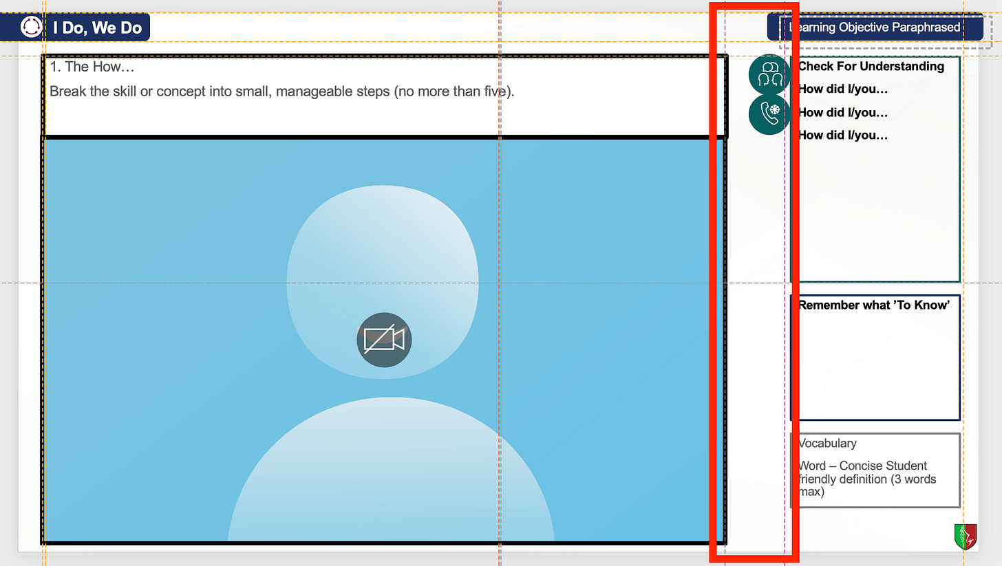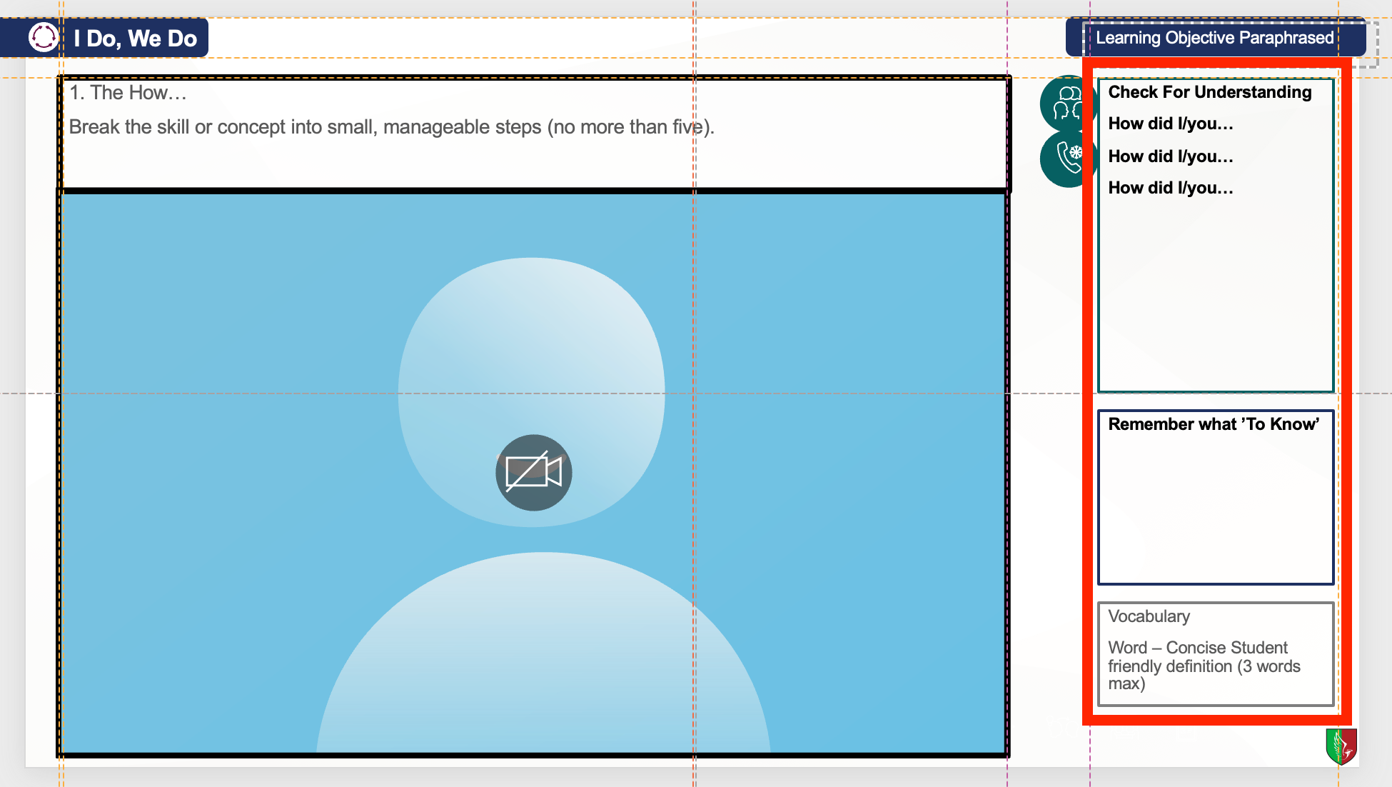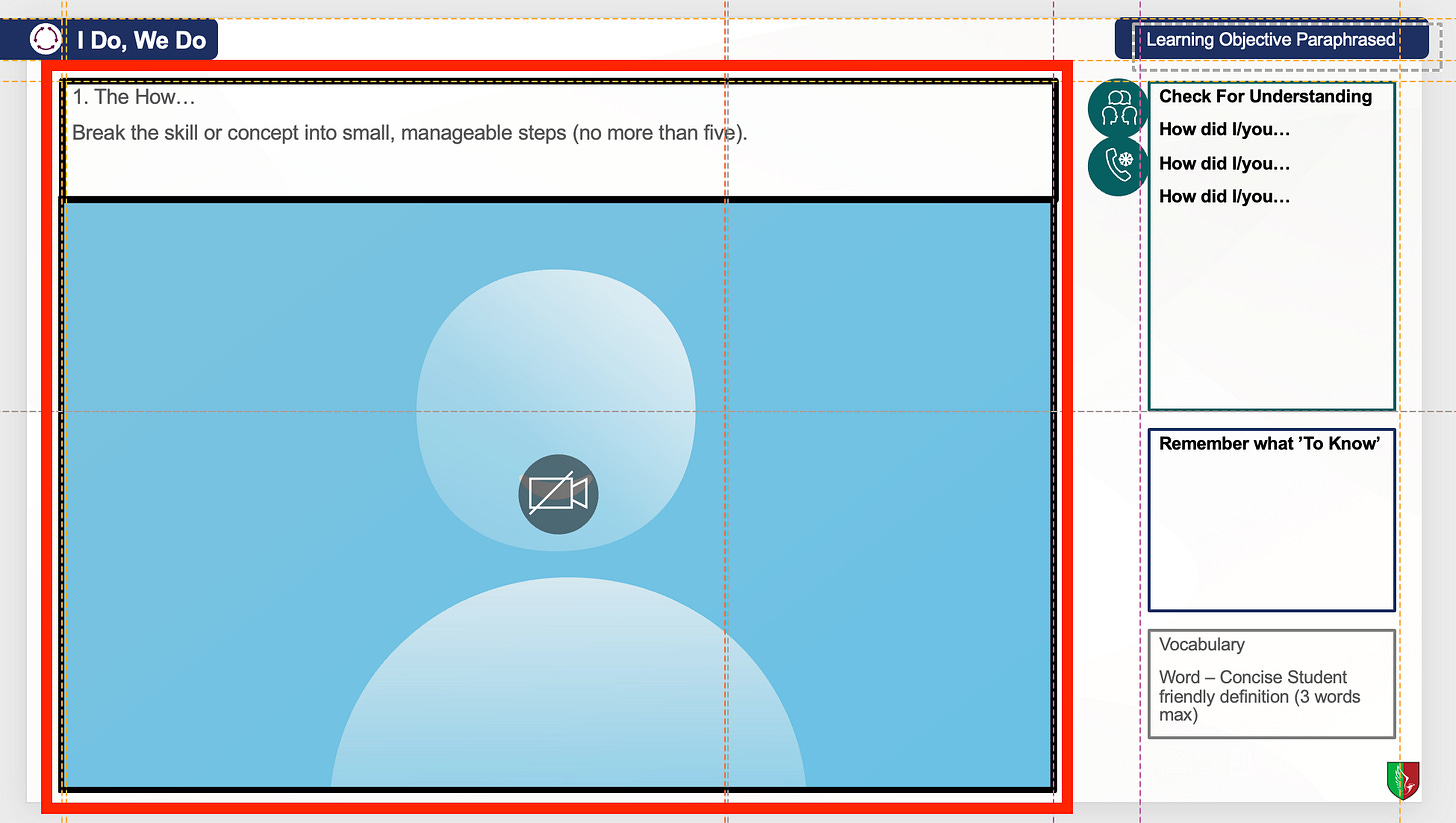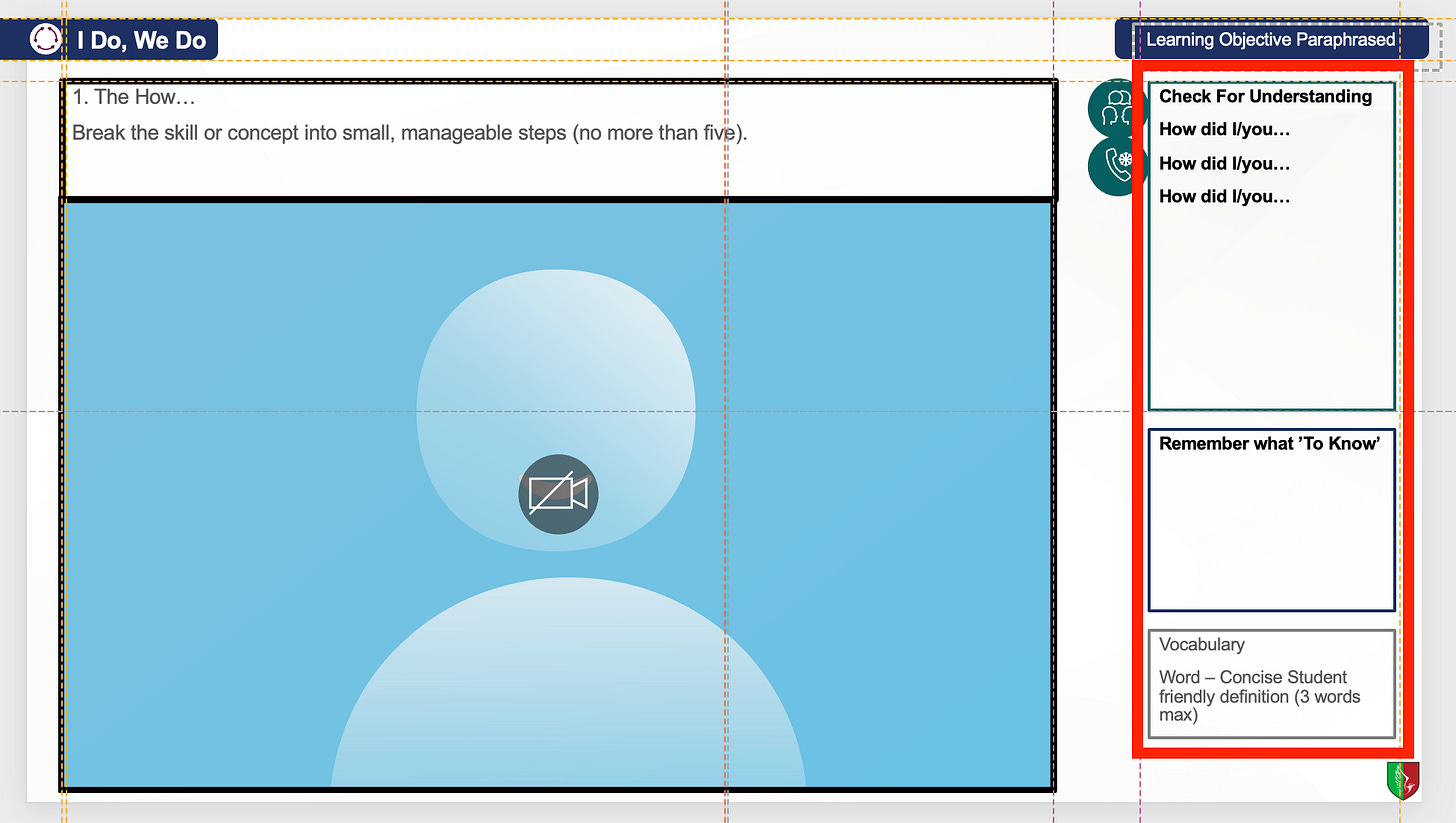 Stable anchors. Choose a couple of regions that rarely move. For example, the learning goal, a definition, and the check-for-understanding area. Stability lets latecomers re-enter without asking where they are.