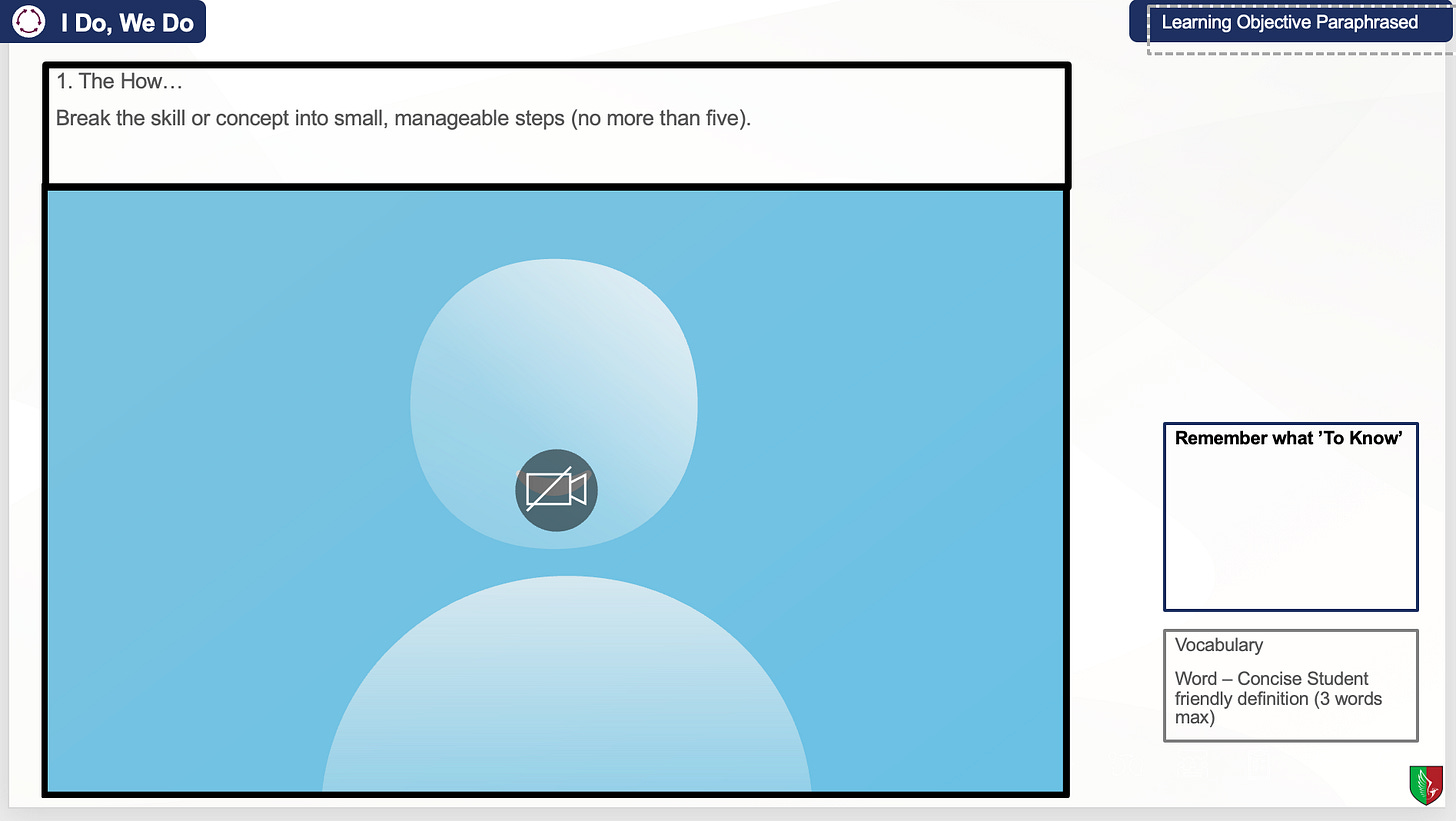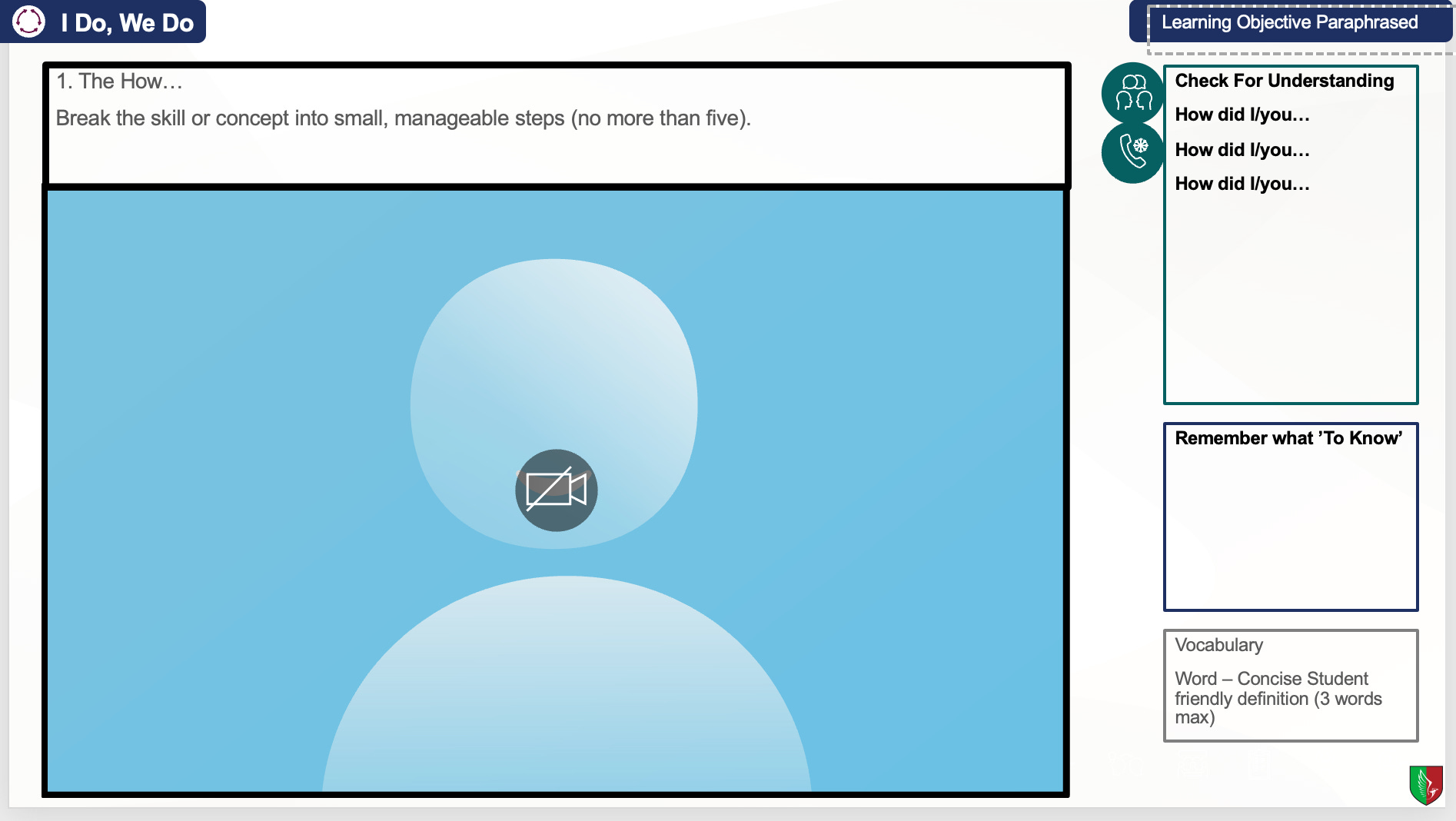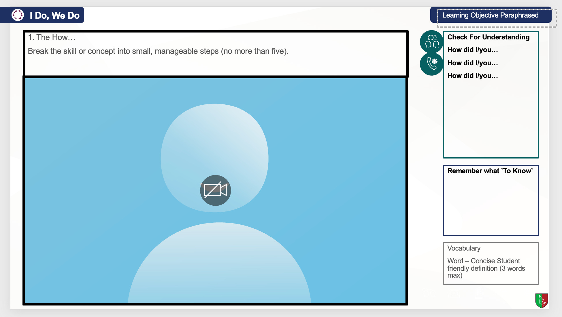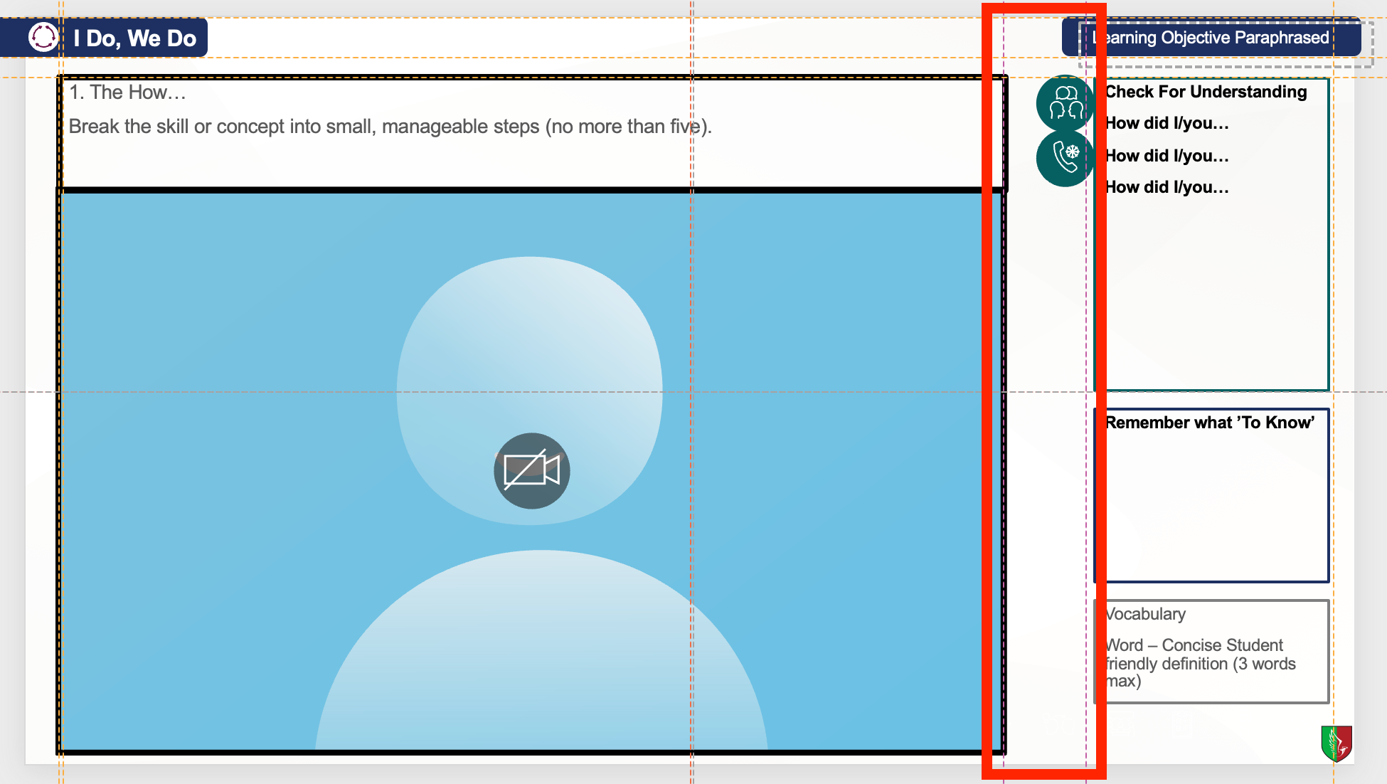 Stable anchors. Choose a couple of regions that rarely move. For example, the learning goal, a definition, and the check-for-understanding area. Stability lets latecomers re-enter without asking where they are.